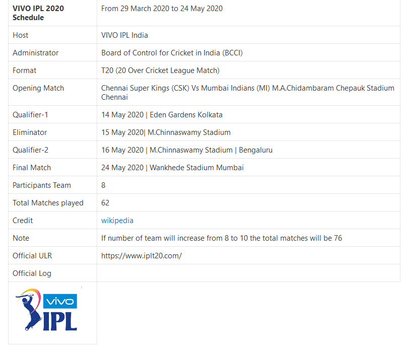 VIVO IPL 2020 has been scheduled between 29 March 2020 and 24 May 2020. Opening match will be played on 29 March 2020 between the Mumbai Indians (MI) Vs Chennai Super Kings (CSK)* which will be played in Wankhede Stadium Mumbai, Maharashtra. || Final match expected to be played on Date 24/May/2019. //Here you will get || the Schedule, Team, Venue, Time Table, PDF download, Point Table, Ranking & Winning Prediction||.